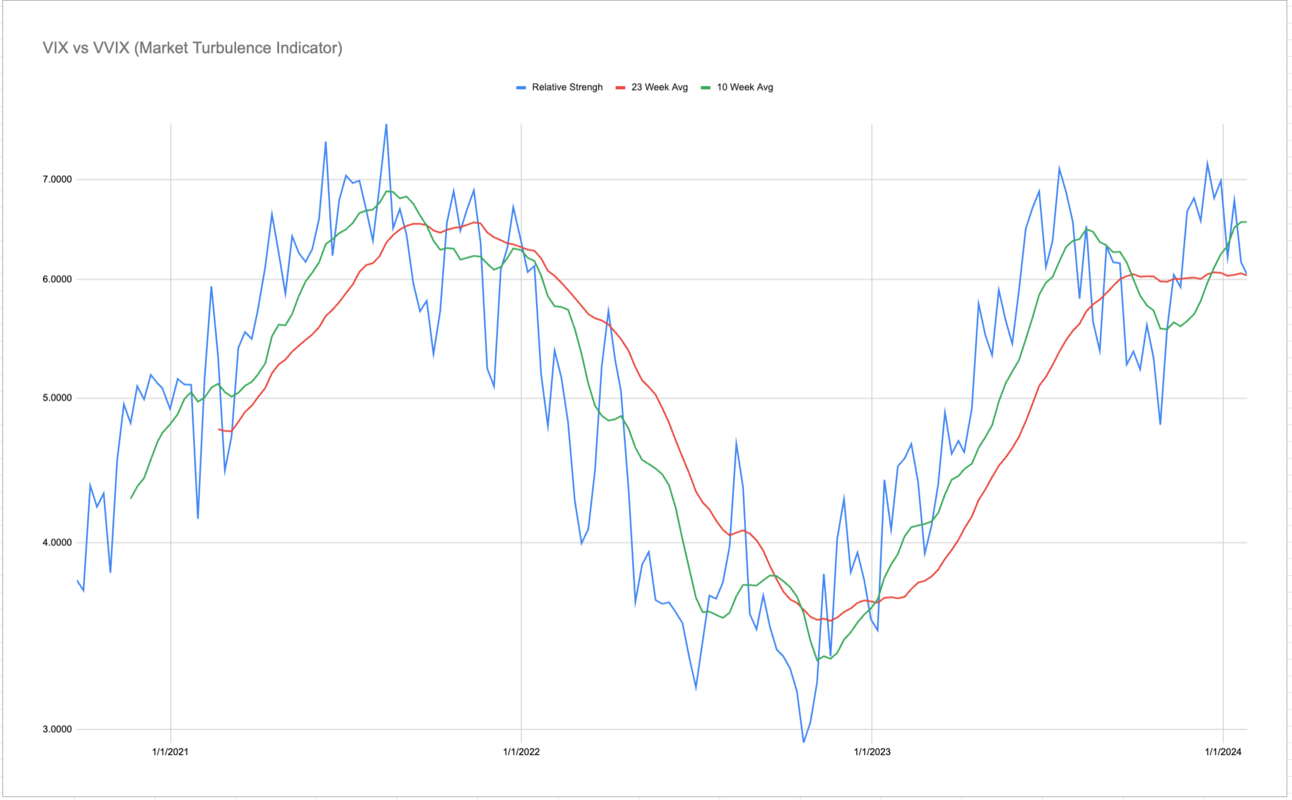 VIX / VVIX improved! Blue up is good, blue down is bad. The blue line has a HIGH CORRELATION to overall markets. We need to respect the possibility the blue line goes south again.