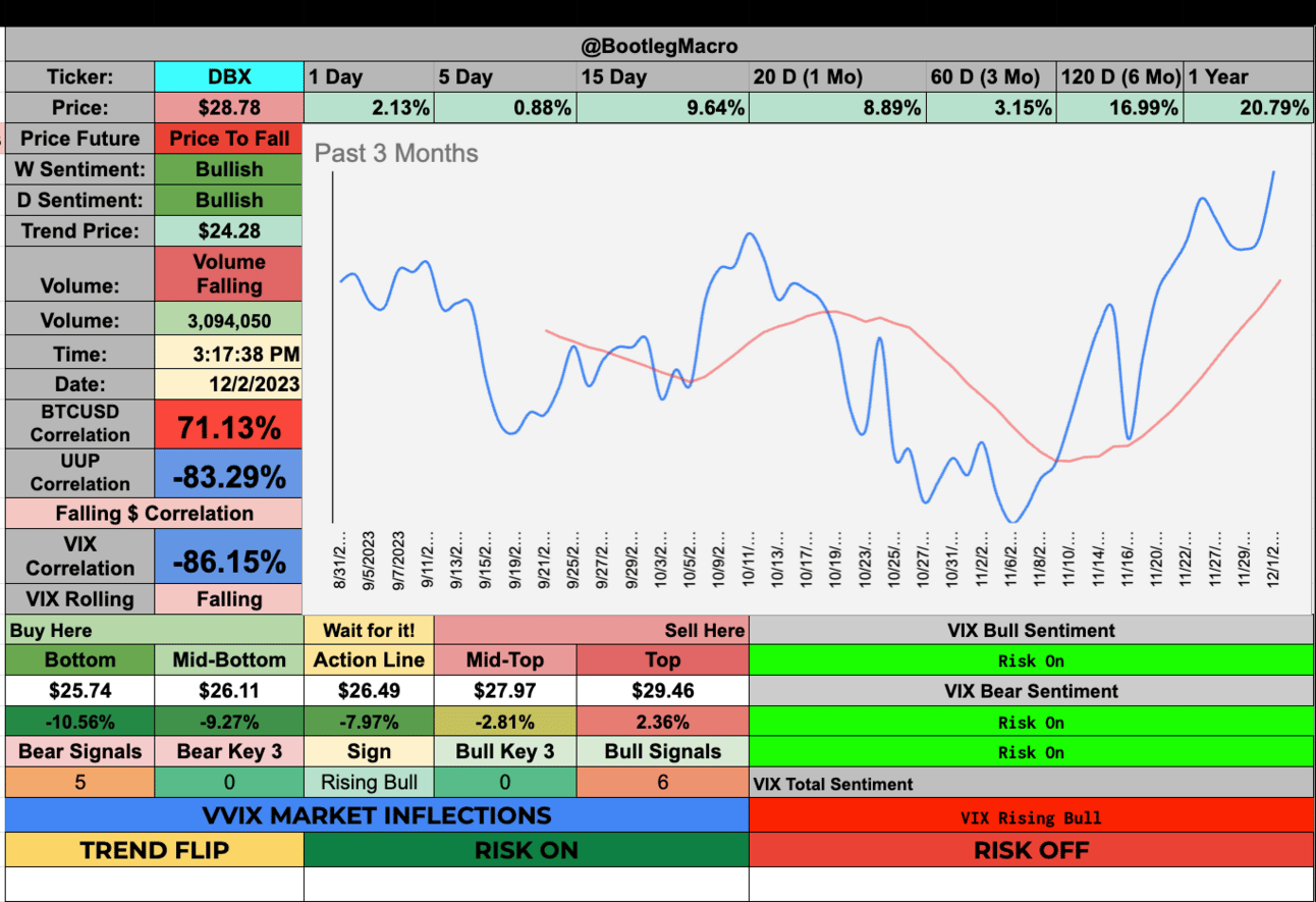 VIX / VVIX improved! Blue up is good, blue down is bad. The blue line has a HIGH CORRELATION to overall markets. You see the up and down…we are back above the 23 Week Moving Average. Which is significant.