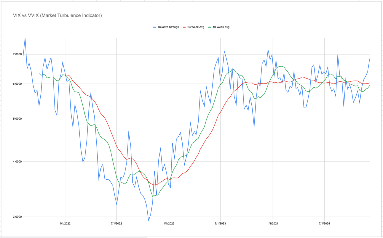 Market Turbulence Indicator improved! Blue up is good, blue down is bad. The blue line has a HIGH CORRELATION to overall markets. You see the up and down…we are back above the 23 Week Moving Average. Which is significant.