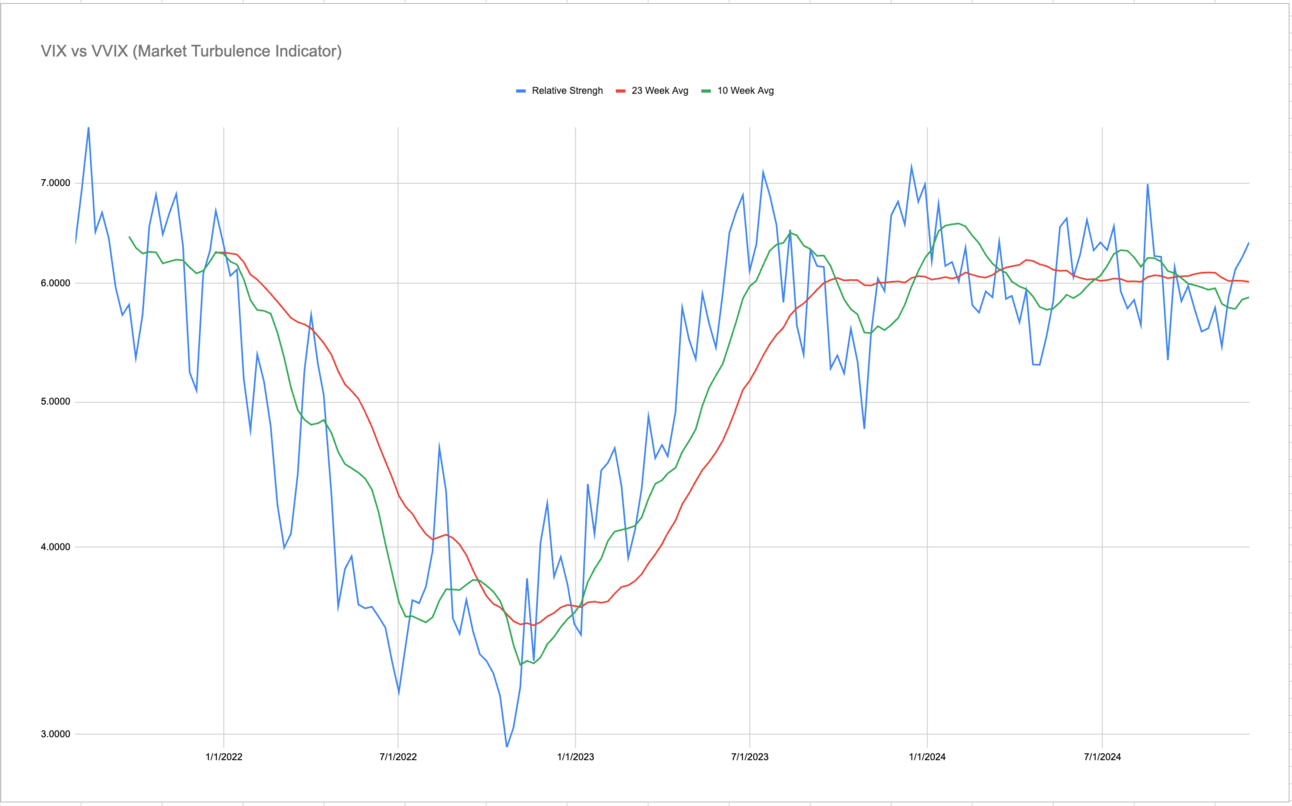 Turbulence continues to improve. Blue up is good, blue down is bad. The blue line has a HIGH CORRELATION to overall markets. You see the up and down…we are back above the 23 Week Moving Average. Which is significant.