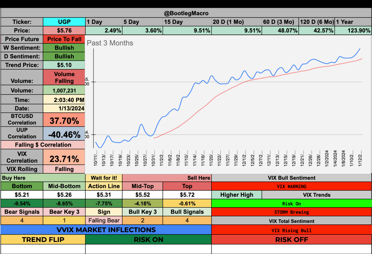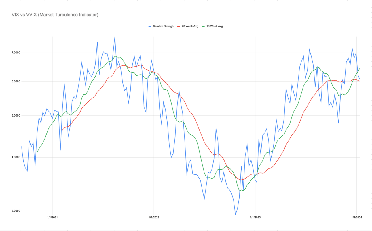 VIX / VVIX improved! Blue up is good, blue down is bad. The blue line has a HIGH CORRELATION to overall markets. You see the up and down…things can get very choppy quickly in this market. The recent bottom we see in the blue line is 10/31/23. It appears we may be going for a new bottom very soon.