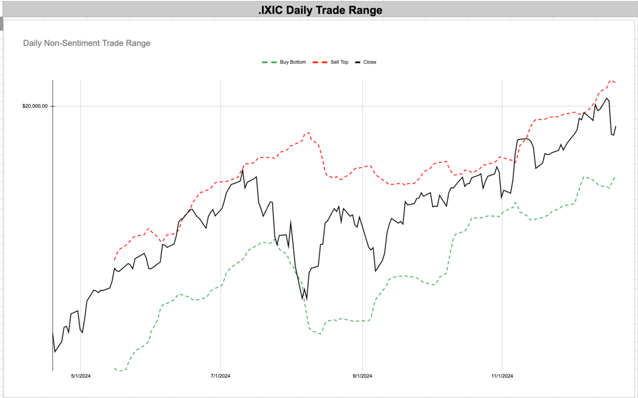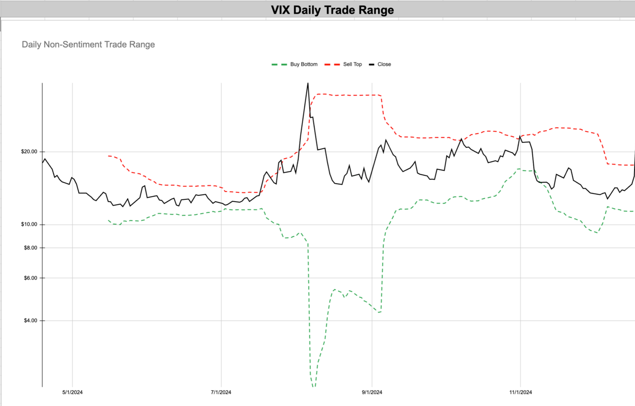 The VIX’s recent spike above $20 briefly shook up the market but has since retreated below critical resistance levels. The red “Sell Top” line suggests a ceiling around $24.65, while the green “Buy Bottom” is holding near $9.89. These levels act as guardrails, signaling the market’s potential range. A fall below $12.84 (action line) could indicate a return to calmer waters, while a breach above $18.75 signals renewed market fear.
